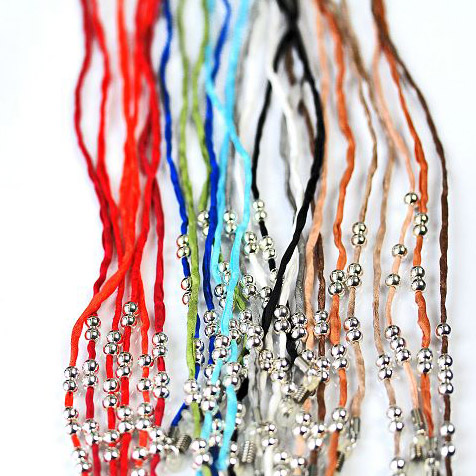 Die Brillenbänder aus 100% Seide sind mit versilberten Perlen besetzt und werden ganz klassisch mit Ösen an den Bügelenden befestigt.