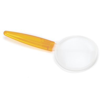 ...für Durchblicker einfache Handlupe mit plankonvexer Acryl-Linse für Freizeit, Hobby und Beruf transparentfarbige Handgriffe Durchmesser: 60mm Vergrößerung: 6D - 2,5x Grifffarbe: orange-transparent Gewicht: 36g