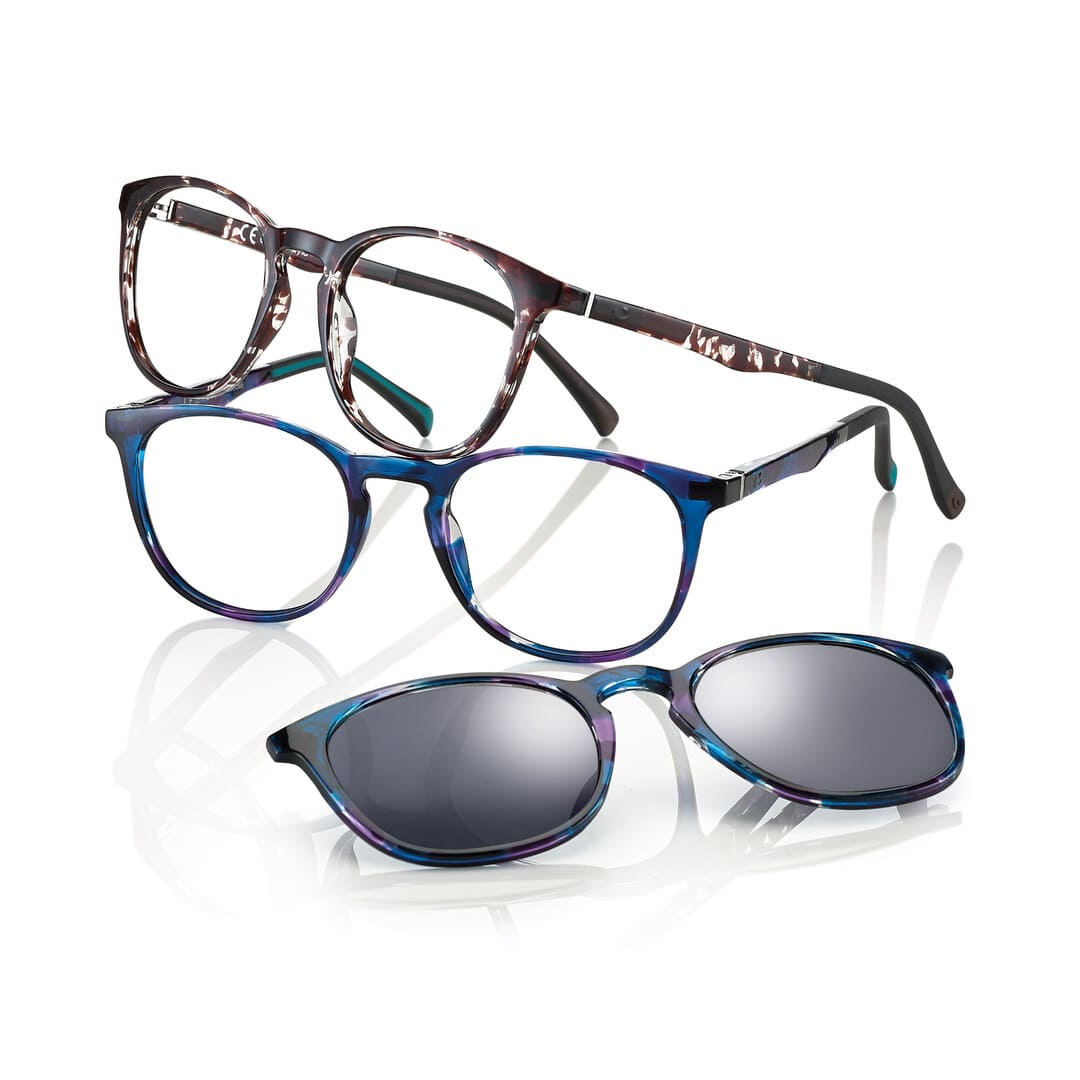 Fassung inkl. magnetischem ClipOn, ein Etui für die Fassung, ein Etui für den Clip, plus Mikrofasertuch