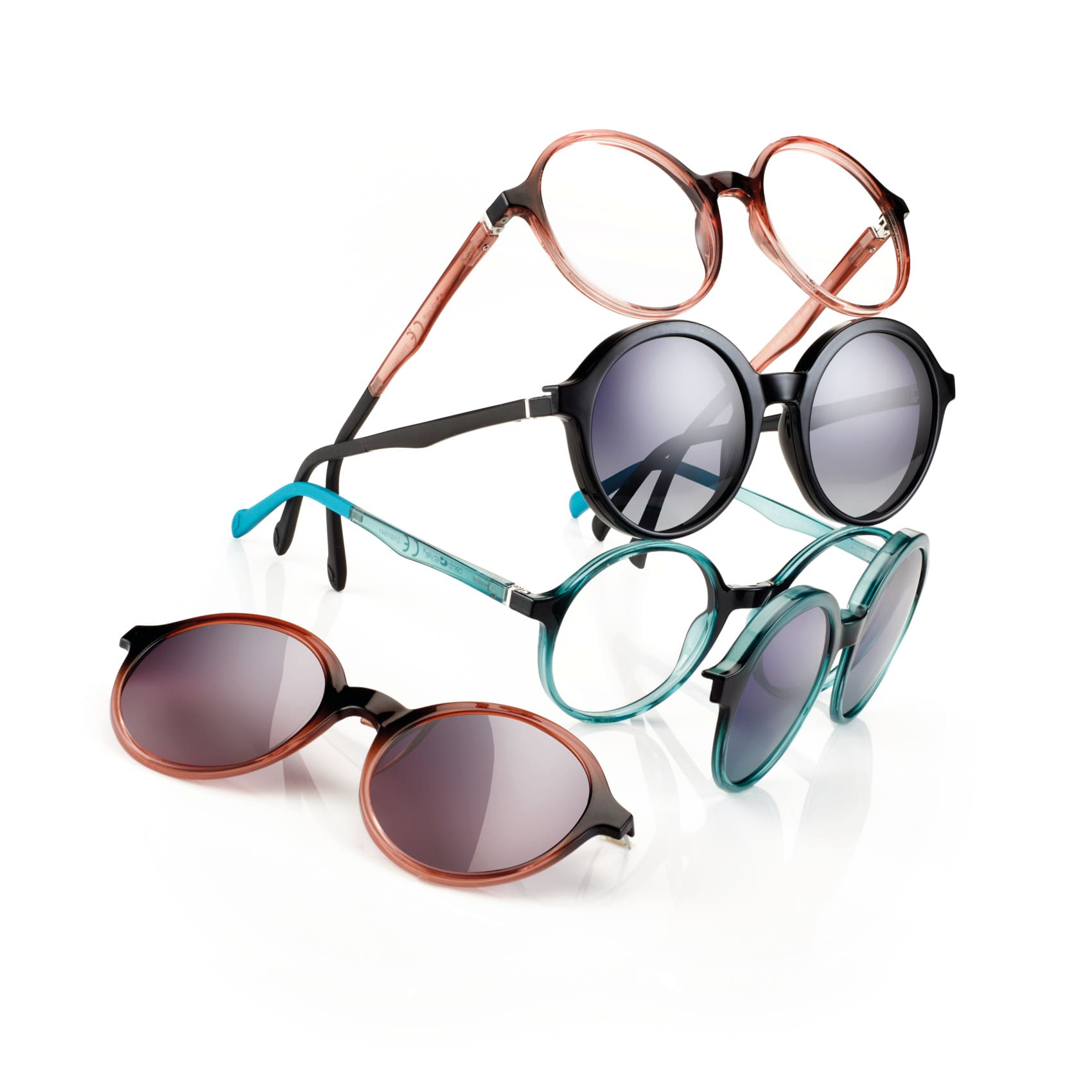 Fassung inkl. magnetischem ClipOn, ein Etui für die Fassung, ein Etui für den Clip, plus Mikrofasertuch