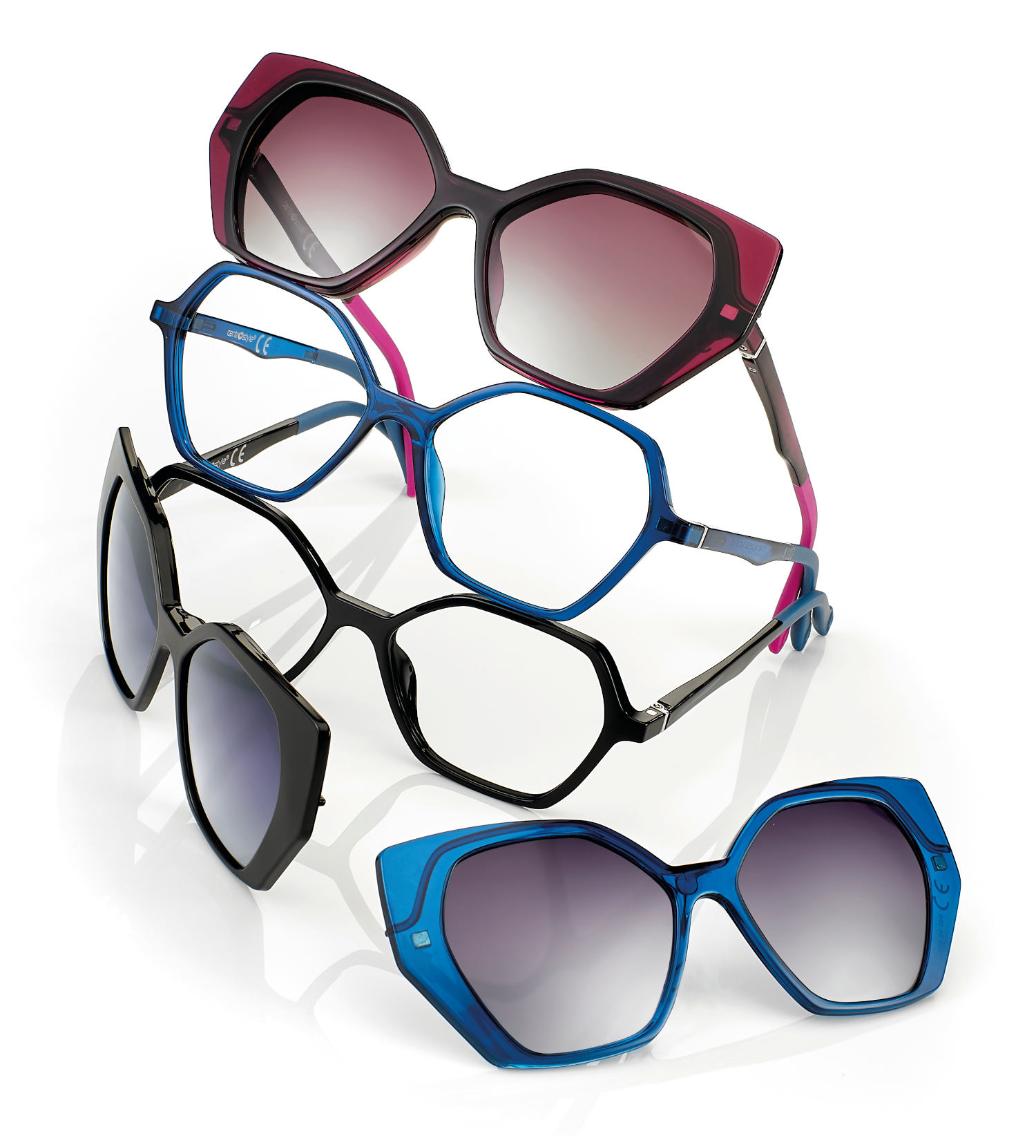 Fassung inkl. magnetischem ClipOn, ein Etui für die Fassung, ein Etui für den Clip, plus Mikrofasertuch
