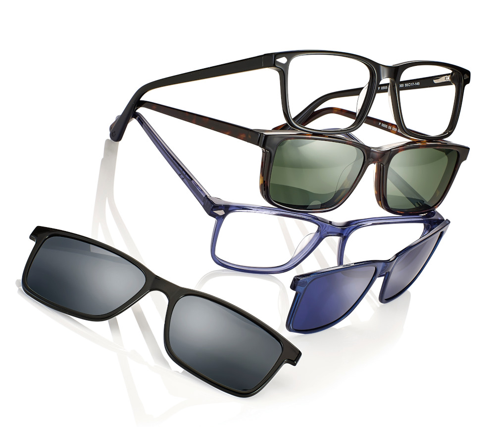 Acetat Fassungen in verschiedenen Farben, mit magnetischem Sonnenclip (aus Ultem, Gläser polarisierend)